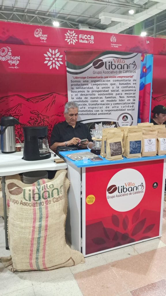 Neiva (Huila), 26 de septiembre de 2025 – Los productores del Grupo Asociativo de Café Villalíbano, liderados por Carlos Polo, llegaron desde el municipio PDET de Algeciras (Huila) a Neiva para presentar su marca Coffi Saitas en la Quinta Feria Internacional del Café, Cacao y Agroturismo (FICCA).